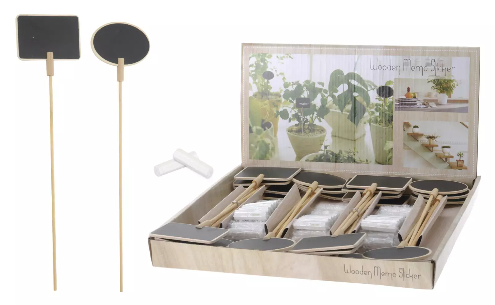 Suloinen ja monikäyttöinen minitaulu esimerkiksi yrttien merkintään, juhlapöytään tai myyntitiskiin. Mukana liitu valmiiksi käyttöön.