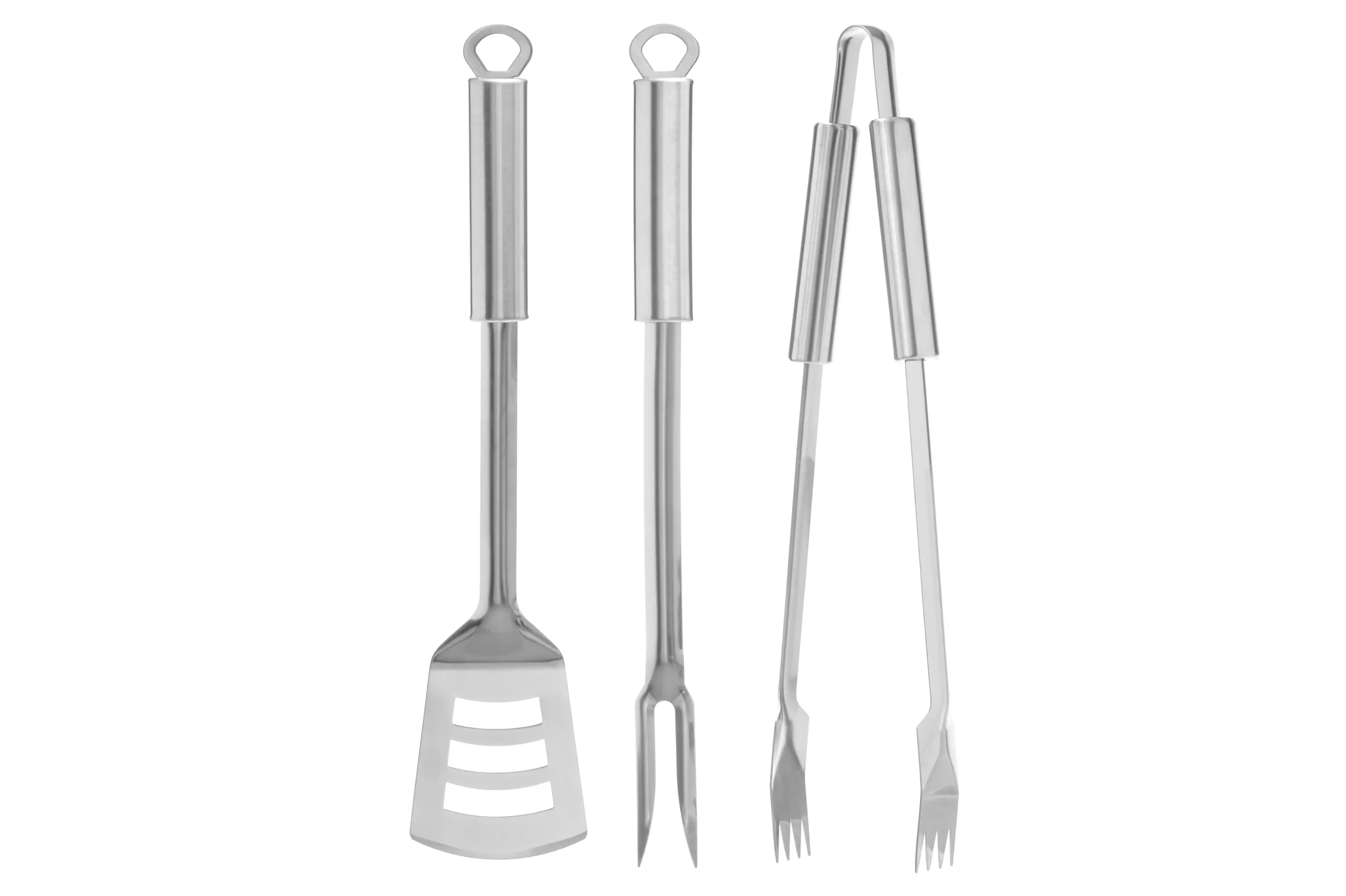 Ruostumattomasta teräksestä valmistettu 3-osainen grillausvälinesarja. Lasta 41,5 x 8,5 cm. Haarukka 42 x 4 cm. Pihdit 41,5 x 3 cm.