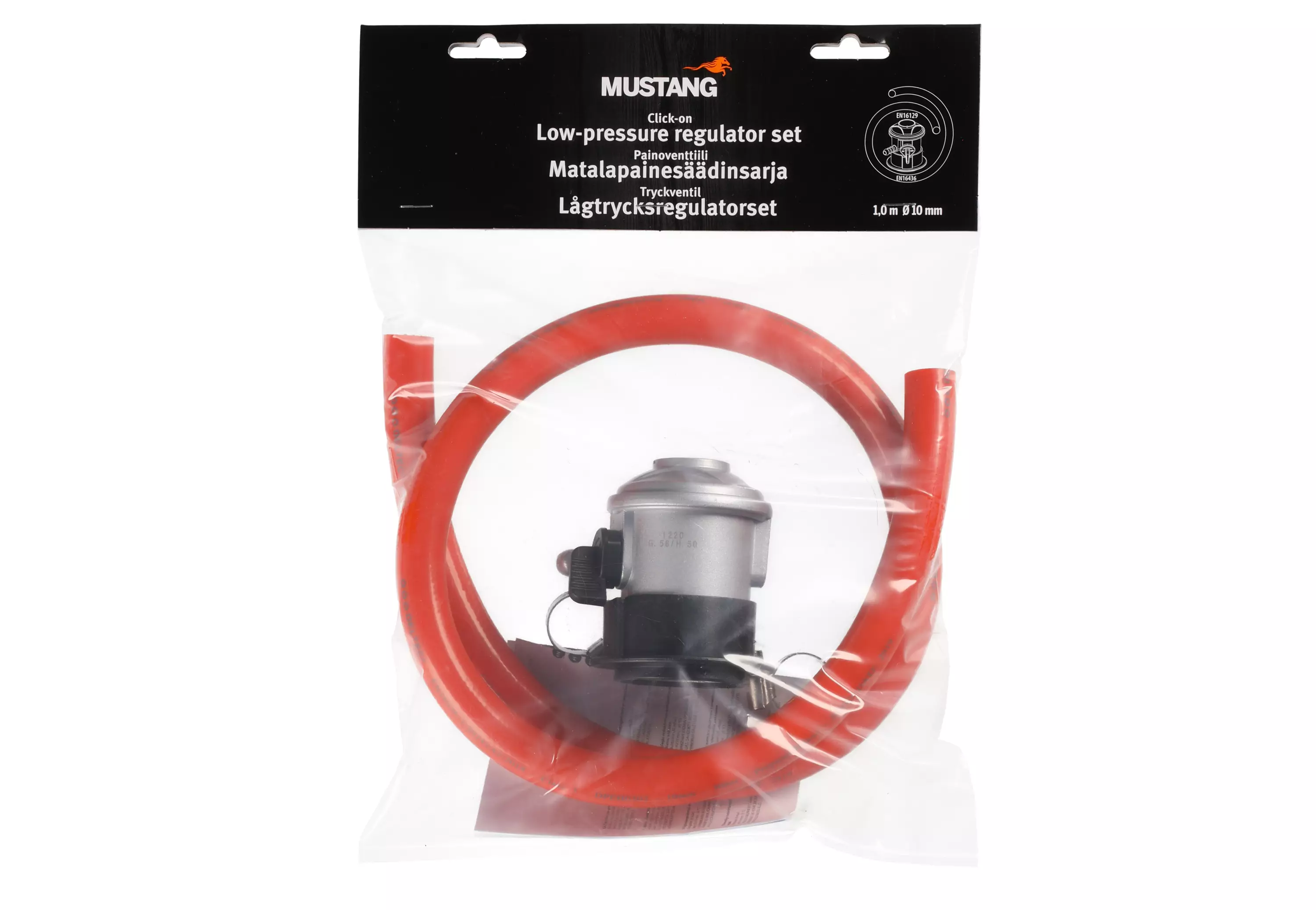 Paineensäädin 30mbar, sisätää EFV turvaventtiilin, joka rajoittaa kaasunvirtausta jos kaasuletku katkeaa tai irtoaa. Läpivirtaus 1,5 kg/h. Letku 1m/10 mm, -30 °C. Letkunkiristimet 2 kpl. Standardin EN16129 mukainen paineensäädin. EN16436 standardin mukainen muovisekoiteletku.