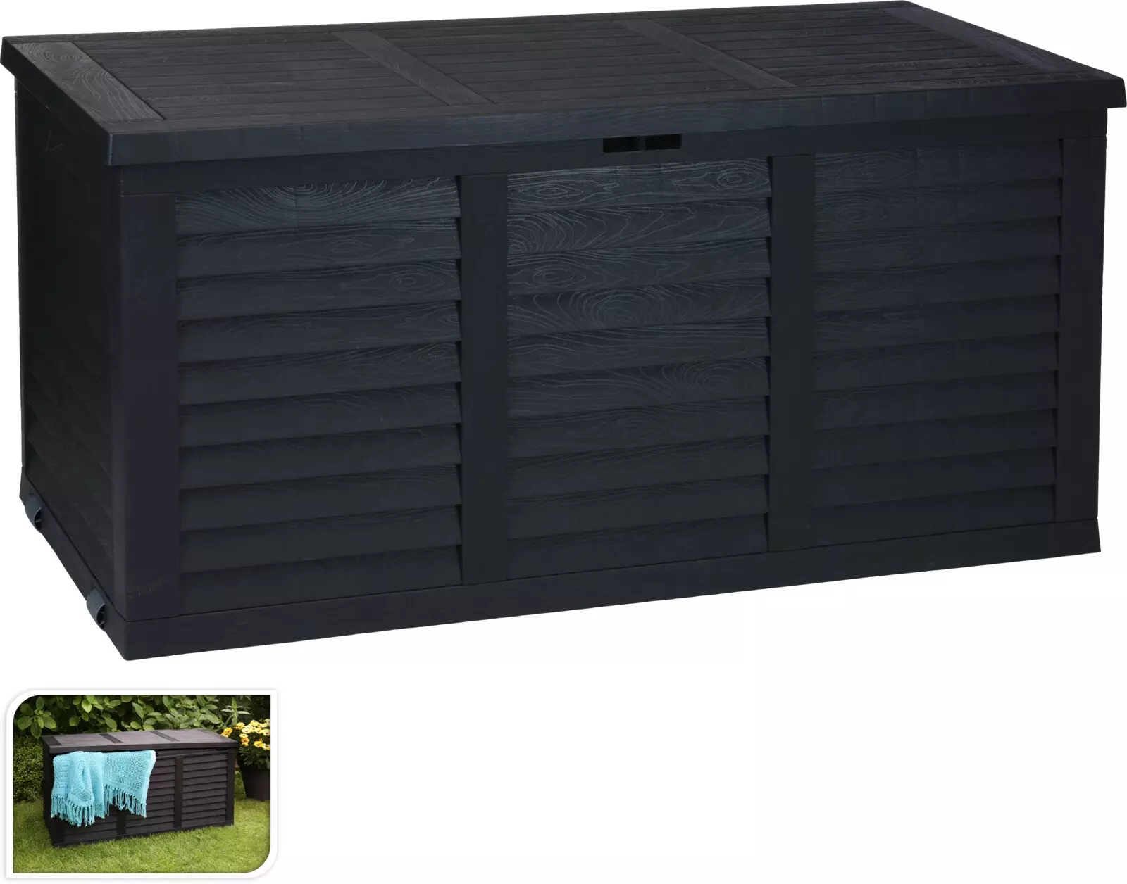Puutarhalaatikko 300 L Tilava ja tukeva säilytysratkaisu pihalle tai terassille. Ominaisuudet • Tilavuus: 314 litraa • Koko: n. 120 × 52 × 58 cm • Väri: tummanharmaa • Pyörät helpottavat... Lue lisää