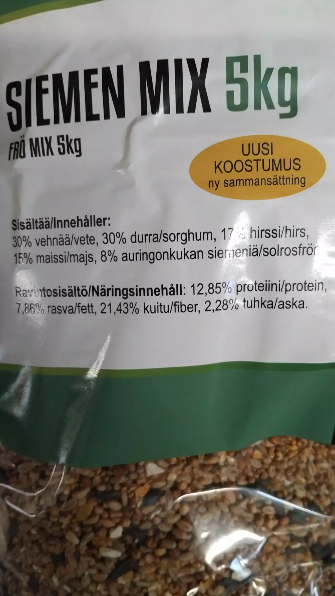 Monipuolinen ja ravitseva erityisesti pikkulintujen talviruokintaan suunniteltu siemenseos. Sisältää/lnnehåller: 30% vehnää/vete, 30% durra/sorghum, 17 hirssi/hirs. 15% maissilmajs, 8% auringonkukan sierneniä/solrosfrör