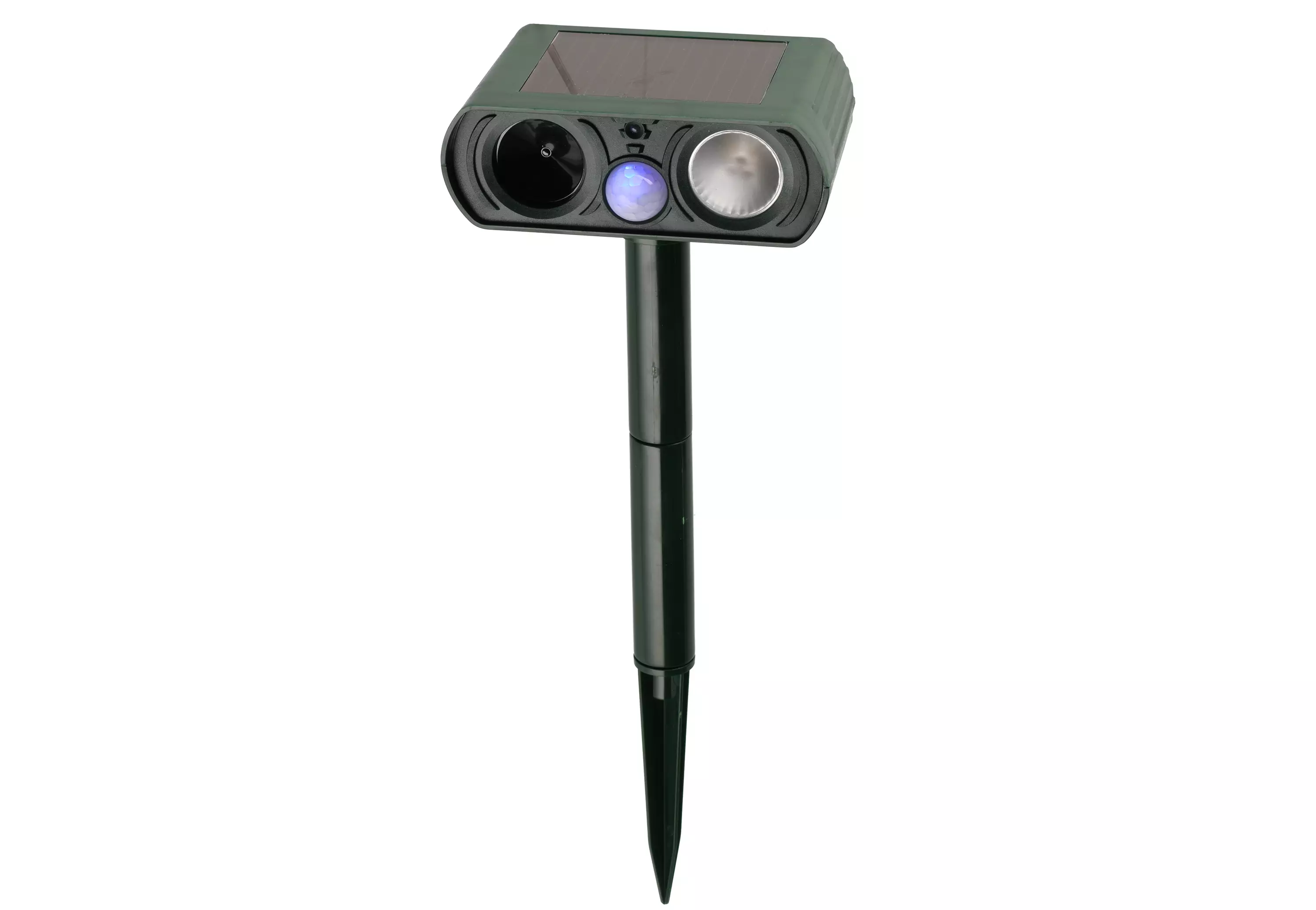 Eläinkarkoitin ulkokäyttöön. Säikäyttää eläimet ultraäänen sekä vilkkuvan valon yhteisvaikutuksella. Ominaisuudet aktivoituvat kun eläin saapuu liiketunnistimen alueelle. Automaattinen karkotustaajuuden vaihto. 5 eri taajuusaluetta 25 kHz, 35 kHz, 45 kHz, 55 kHz sekä 61 kHz erilaisten eläimien karkoittamiseksi. Tehoalue 10 m ja havaintokulma 110 astetta. Karkotin torjuu mm. jyrsijät, linnut, peurat, ketut, sudet, kissat ja koirat. Sisältää 4 x 2/3AA 300 mAh ladattavaa Ni-MH paristoa.
