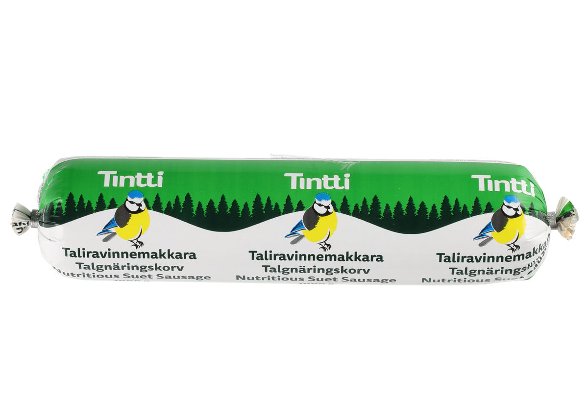 Tintti taliravinnemakkara 1kg tangossa ruokintaverkolla. Pakkauksen koko 6x6x29cm. Sisältö: 27% eläinrasvaa, 20% maapähkinää, 18% auringonkukansiementä, 15% hirssiä, 10% durraa, 10% vehnää.