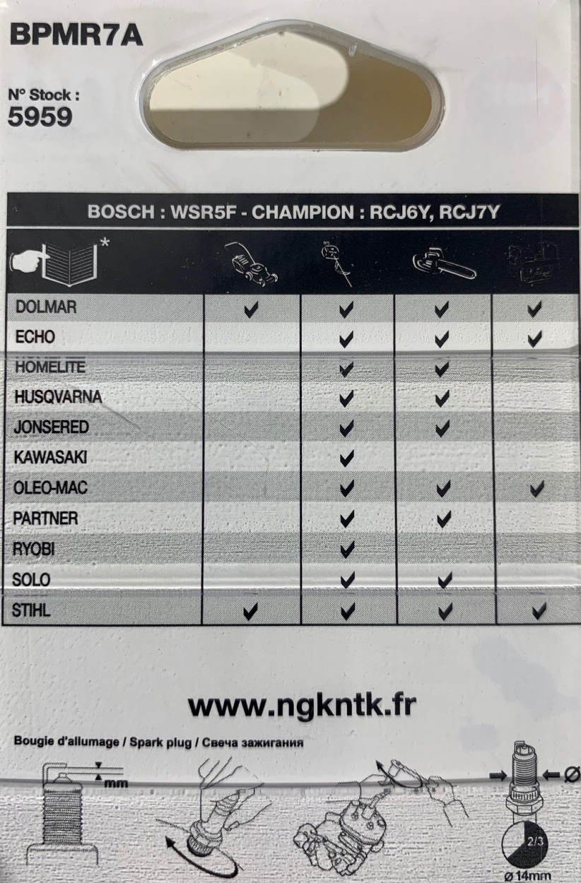 NGK 4626, BOSCH WSR5F, WS8F, WSR8F, 7543 CHAMPION CJ8Y, RCJ6Y, RCJ7Y, 848, 852, 859 DOLMAR 965603021, ECHO, HOMELITE, HONDA 98073-57944, HUSQVARNA 503235111, JONSERED, KAWASAKI, OLEO-MAC, PARTNER, RYOBI, SOLO, STIHL, YAMAHA 90793-20098