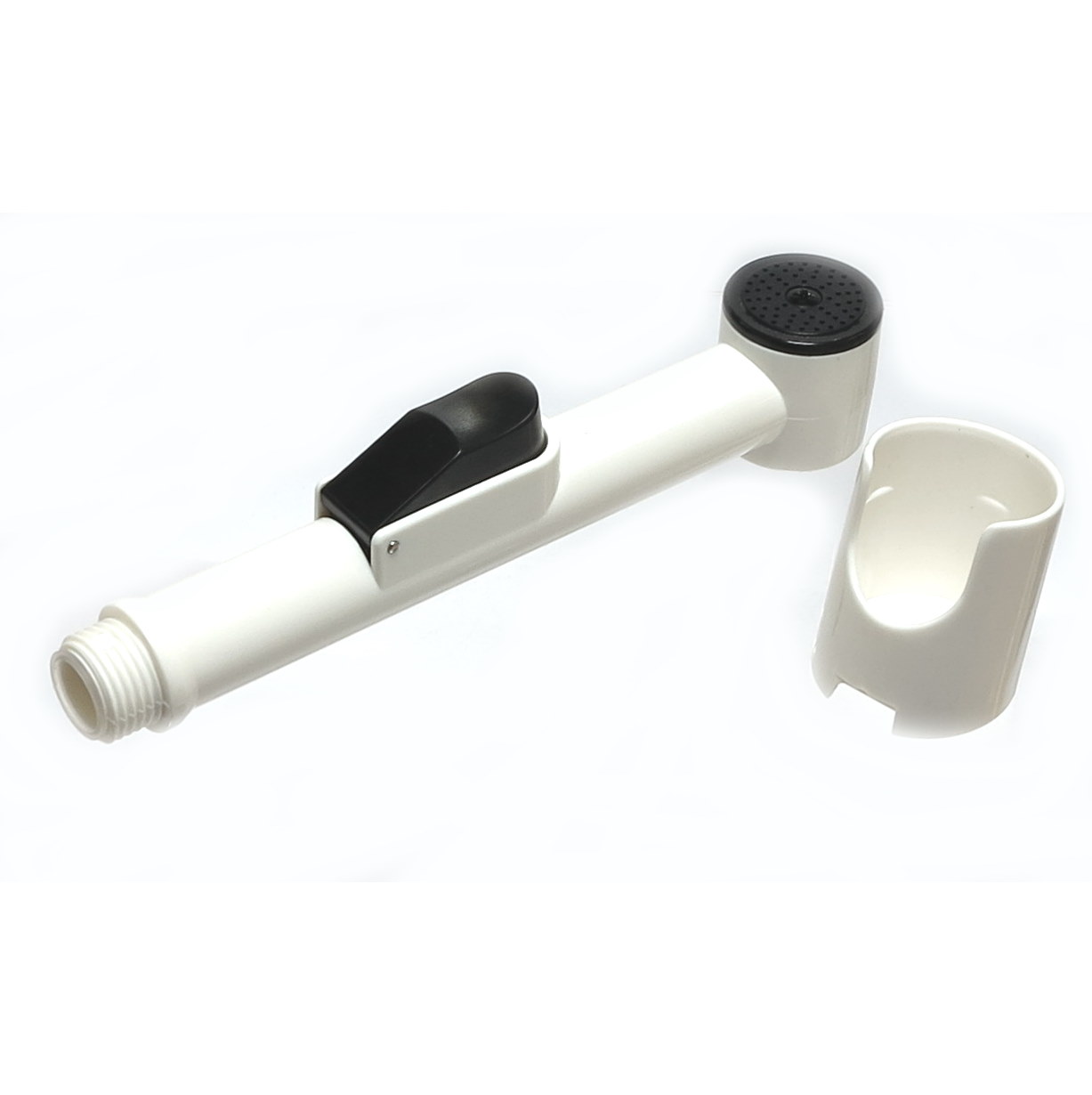 Valkoinen bide-suihkukahva painonapilla ja seinätelineellä