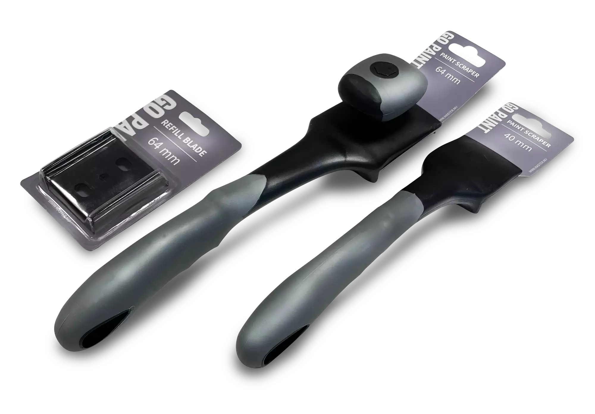 Maalikaavin 40 mm leveällä käännettävällä terällä ja kumipinnatulla kahvalla.