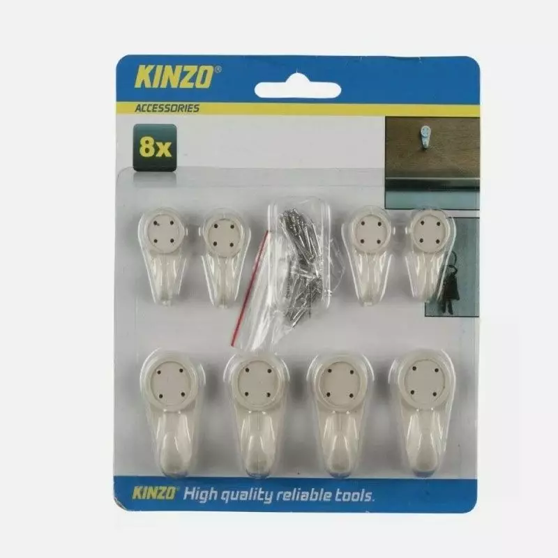 Käytännöllinen Kinzo taulukoukkusetti helpottaa taulujen, valokuvien ja muiden seinäkoristeiden kiinnittämistä. Setti sisältää kahdeksan koukkua sekä tarvittavat kiinnitysnaulat, joiden avulla ripustaminen onnistuu nopeasti ja helposti.