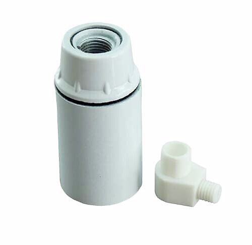 E14-kannalla ja vedonpoistonipalla varustettu bakeliitista valmistettu lampunpidin. M10-kierteellä. Ruuviliittimet.