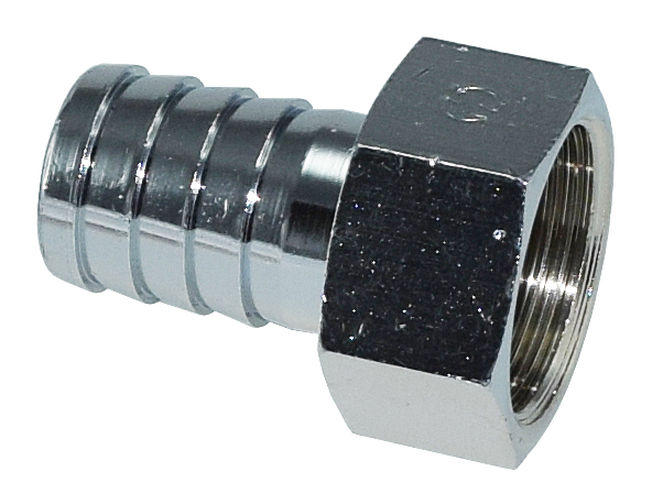 Kromattu letkuliitin esimeriksi letkun kiinnittämiseen pesukoneeseen tai muuhun. Koko 3/4" - 19 mm