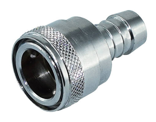 Kromattu liitinpesä kiinteällä letkunipalla. Yhteensopiva yleisimpien kuulapikaliittimien kanssa.
