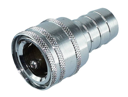 Kromattu liitinpesä kiinteällä letkunipalla. Yhteensopiva yleisimpien kuulapikaliittimien kanssa