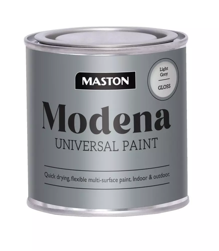 Maston Modena vaaleanharmaa on monipuolinen ja kestävä ilmakuivuva alkydimaali, joka sopii sekä sisä- että ulkokäyttöön. Vaaleanharmaa sävy tuo modernia ja rauhallista ilmettä monenlaisiin kohteisiin ja toimii erinomaisesti esimerkiksi kalusteiden, metalliosien ja sisustuksen yksityiskohtien maalaukseen.