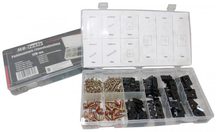 Peltimutteri-/ruuvilajitelma 170-os.Autoruuvisarja Muovikatteiden, verhoilun kiinnitykseen. Ruuvikoot: 40 kpl 3 mm x 8 mm, 20 kpl 4 mm x 16 mm, 15 kpl 5 mm x 12 mm, 10 kpl 6 mm x 20 mm, U-malliset mutterit (eri mallisia):20 kpl 3 mm, 40 kpl 4 mm, 15 kpl 5 mm