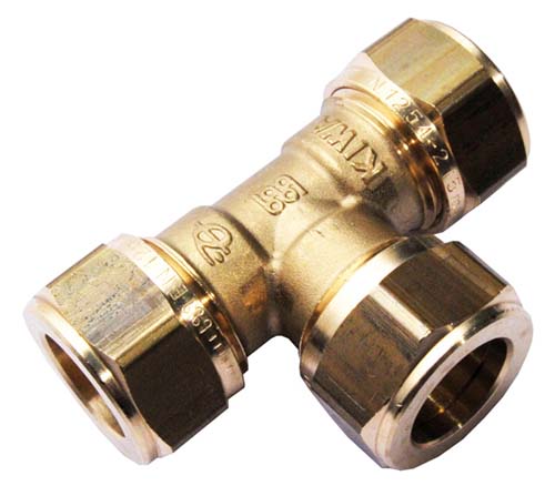 Messinkinen T-haaran muotoinen puserrusliitin. Koko: 15 mm