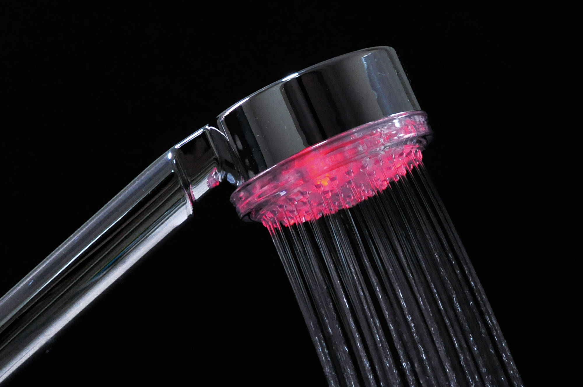 Suihkukahva kromattua muovia. LED suihkukahvan valot vaihtavat väriä lämpötilan mukaan. Sininen < 30°, vihreä 30-39°, punainen > 39°. LED valo saa energiansa veden virtauksesta, joten ulkopuolista virtalähdettä ei tarvita.