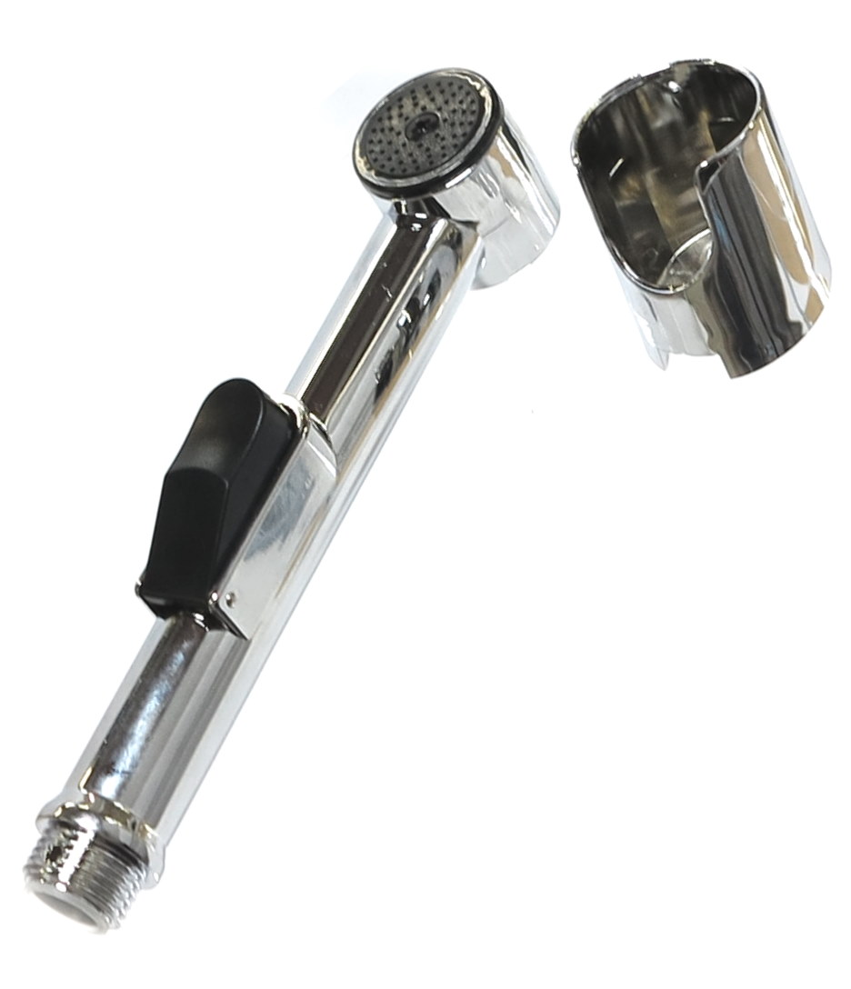 Bide suihkukahva kromi painonapilla ja seinätelineellä.