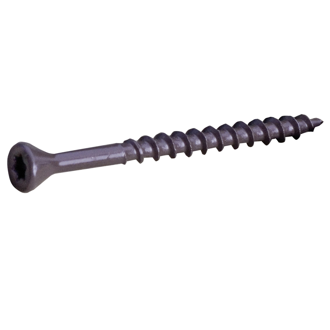Terassiruuvi Ruspert-pinnoitteella, ruskea. TX20-vääntiö siirtää voiman tehokkaasti ruuviin ja ehkäisee kärjen luiskahtamista pois ruuvin urasta. Kanta mukailee Wübau-muotoa – pieni halkaisija, senkkaava uppokanta, upotusnystyrät. Muodon ansiosta erillistä senkkausta ei tarvita ja ruuvi voidaan kiinnittää kovaan materiaalin yhdessä vaiheessa.
