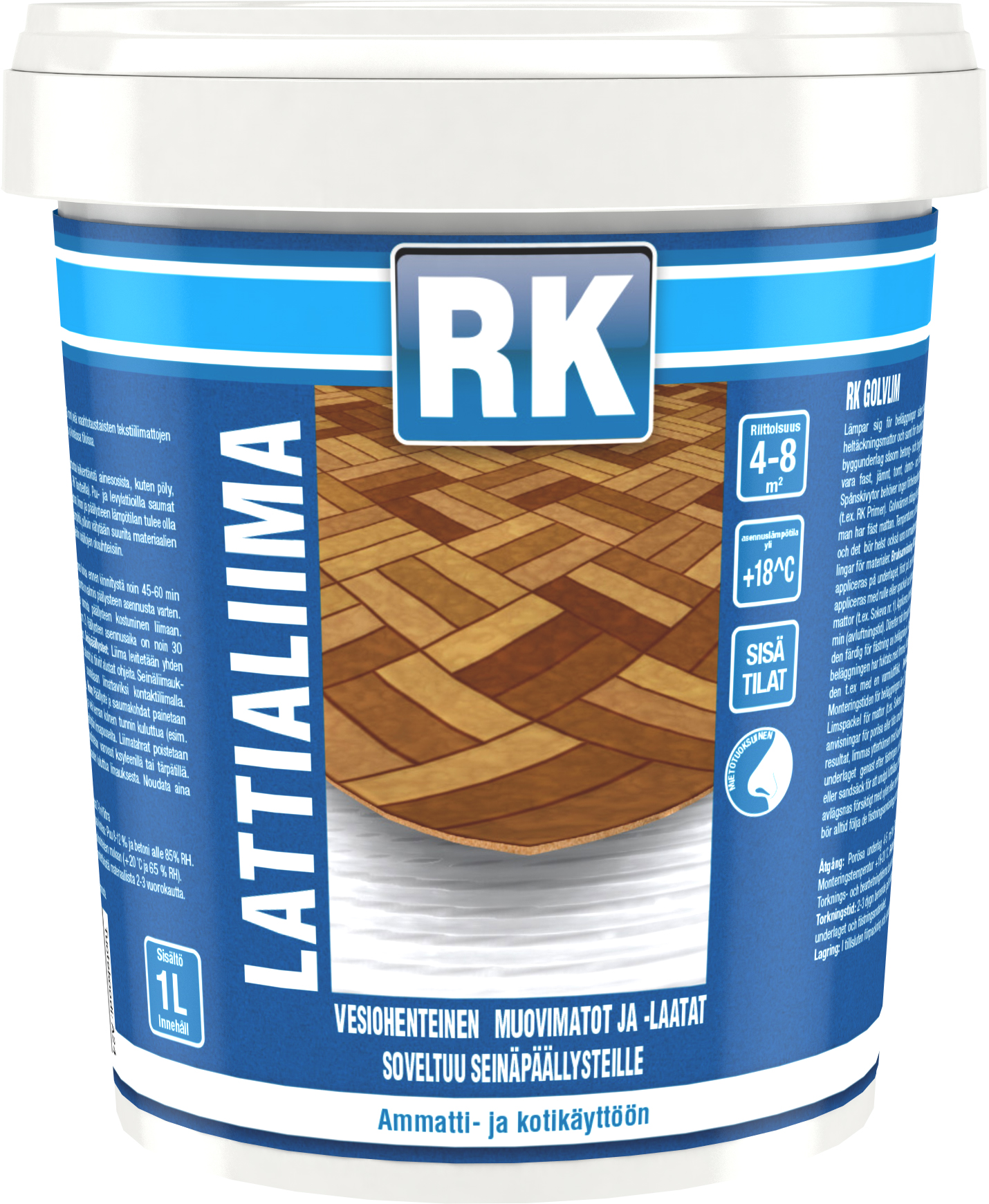 Vesiohenteinen lattian- ja seinänpäällysteiden muovidispersioliima. Soveltuu vinyyli. muovi-. tekstiili-. linoleumi-. neulehuopa-. kokolattiamatto- ja korkkilattiapäälysteille (korkki yli 4 mm) sekä vinyyli (yli 0.6 mm) seinäpäällysteille.