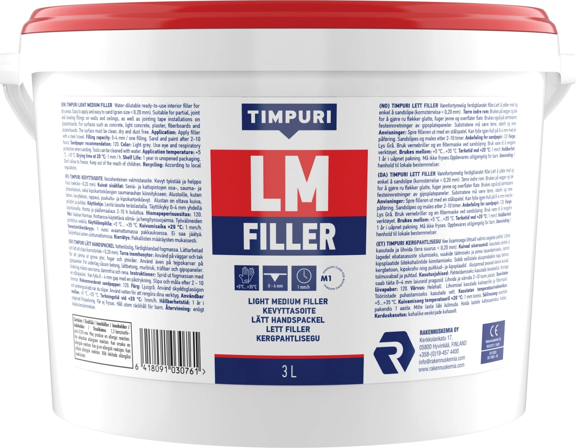 Käyttövalmis, vesiohenteinen ja M1-luokiteltu kevyt tasoite, joka on kevyt työstää ja helppo hioa. Tasoite ei sisällä asbestia tai lasikuitua. Kevyt työstää ja helppo hioa (raekoko <0,20 mm). Soveltuu kuivien sisätilojen seinä- ja kattopintojen osa-, sauma- ja ylitasoituksiin, sekä kipsikartonkilevyjen saumanauhan kiinnitykseen. Soveltuu rakennusalustoille, kuten betoni-, kevytbetoni-, rappaus-, puukuitu- ja kipsikartonkilevypinnat sekä maalattujen pintojen tasoituksiin. Alustan on oltava kuiva, pölytön ja puhdas. Käyttöohje: Levitä tasoite teräslastalla. Täyttökyky 0-4 mm yhdellä tasoituksella. Hionta ja päällemaalaus 2-10 h kuluttua. Hiomapaperisuositus: 120. Väri: Vaalean Harmaa. Hiottaessa käytettävä silmä- ja hengityssuojaimia. Työvälineiden puhdistus vedellä. Käyttölämpötila: +5 °C… +35 °C. Kuivumisaika +20 °C: 1 mm/h. Varastointikestävyys: 1 vuosi avaamattomassa pakkauksessa. Ei saa jäätyä. Säilytettävä lasten ulottumattomissa. Kierrätys: Paikallisten määräysten mukaisesti.