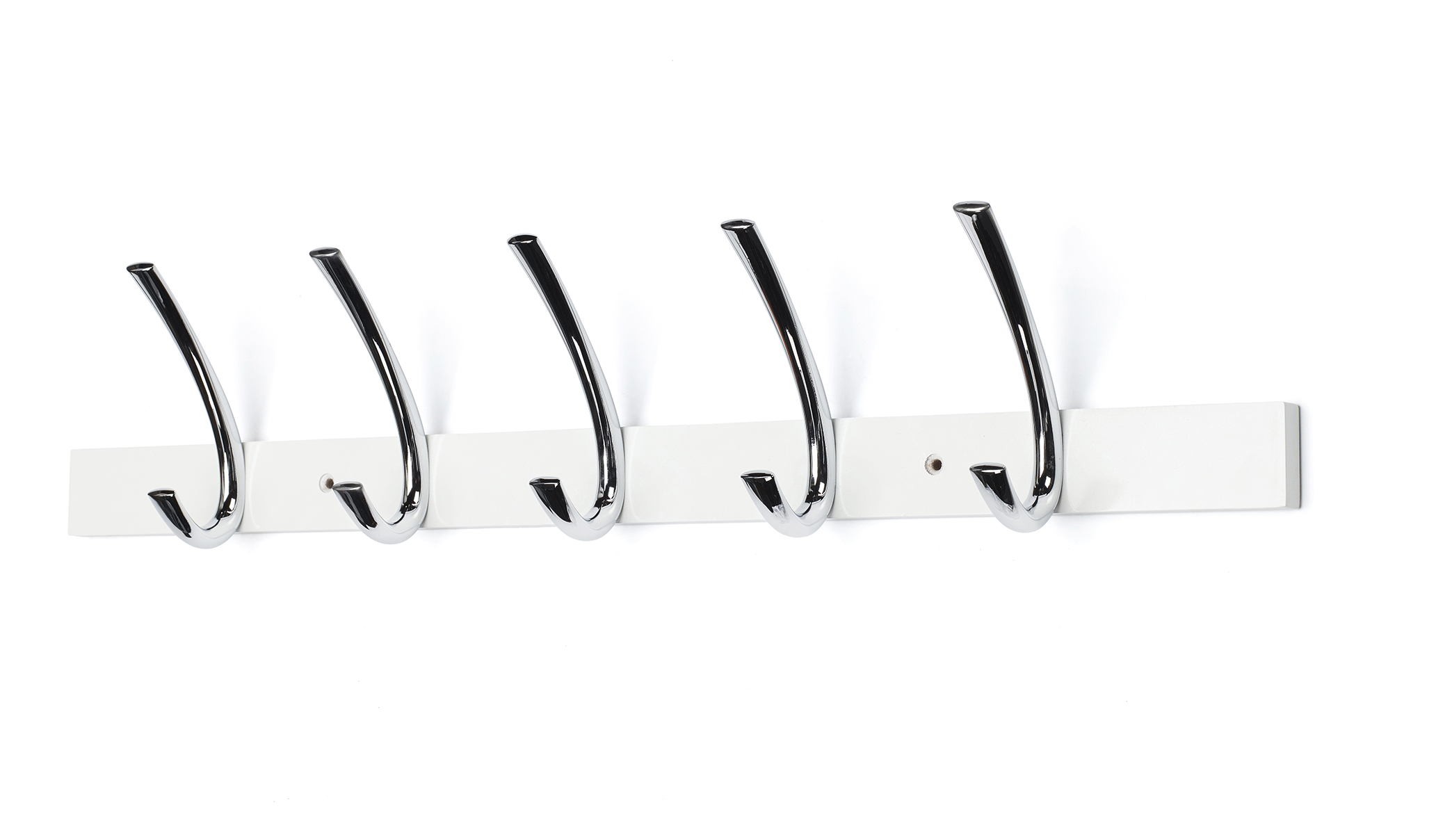 Vaatenaulakko valkoisella korkeakiiltolakkapinnalla ja viidellä kiiltokromatulla koukulla.