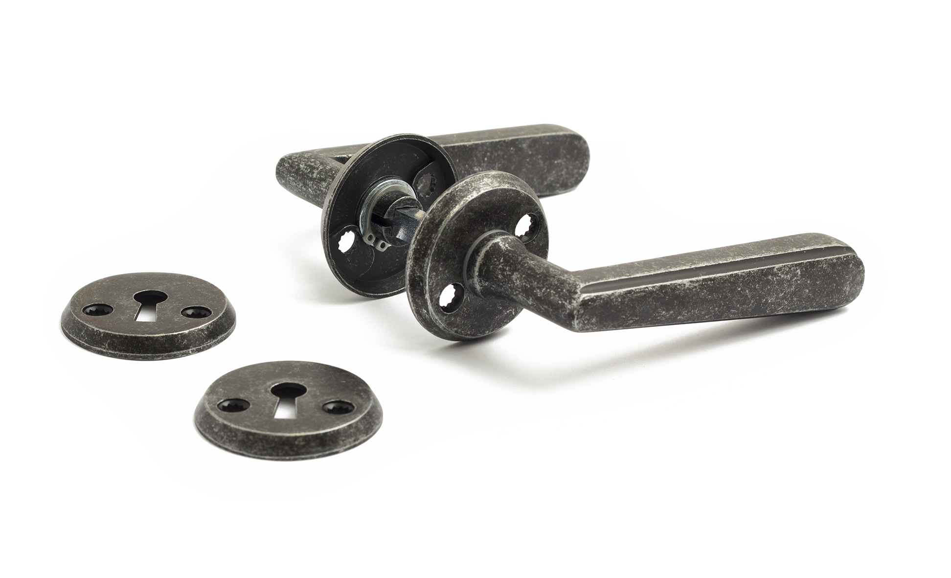 Ovenpainike sinkkiä/samakkia ja tina pintakäsittelyllä. Perinteinen rustiikkinen painike. 38-42 mm vahvuisiin oviin. Ulkonema 52 mm