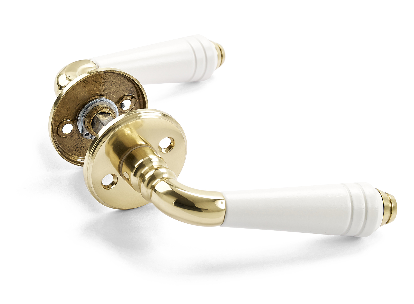 Koristeellinen väliovenpainike messingistä, kiillotettua messinkiä valkoisella puukoristeella