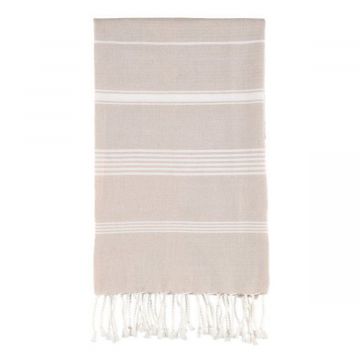 Kudottu raidallinen keittiöpyyhe. Väri beige, ohuet valkoiset raidat. Koko 50 x 70 cm. Materiaali 100 % puuvilla. Pesu 40 asteeessa.