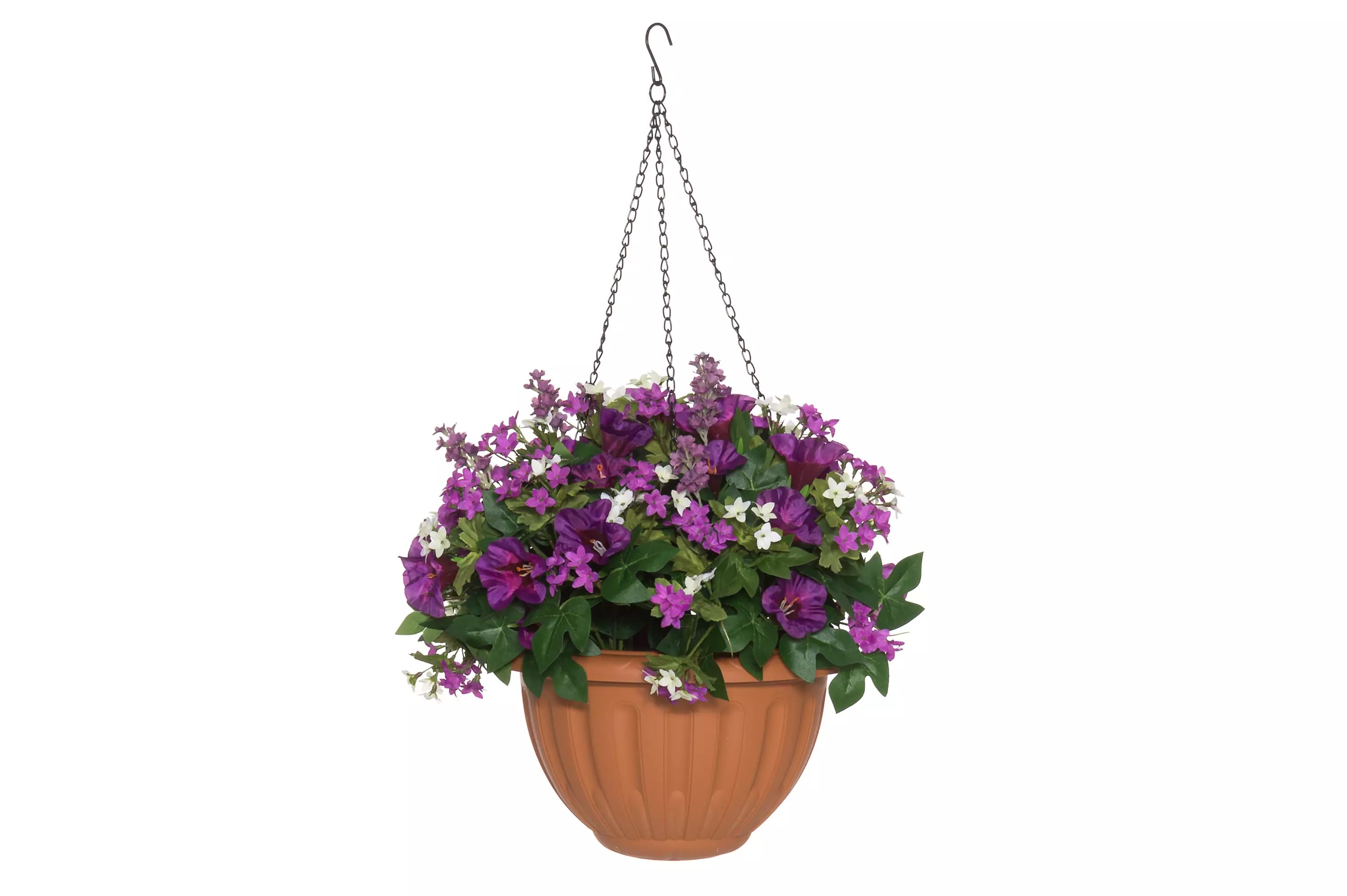 Siniset kukat. Ruukun halkaisija 26,5 cm. Korkeus 55 cm sisältää mustan ketjun.