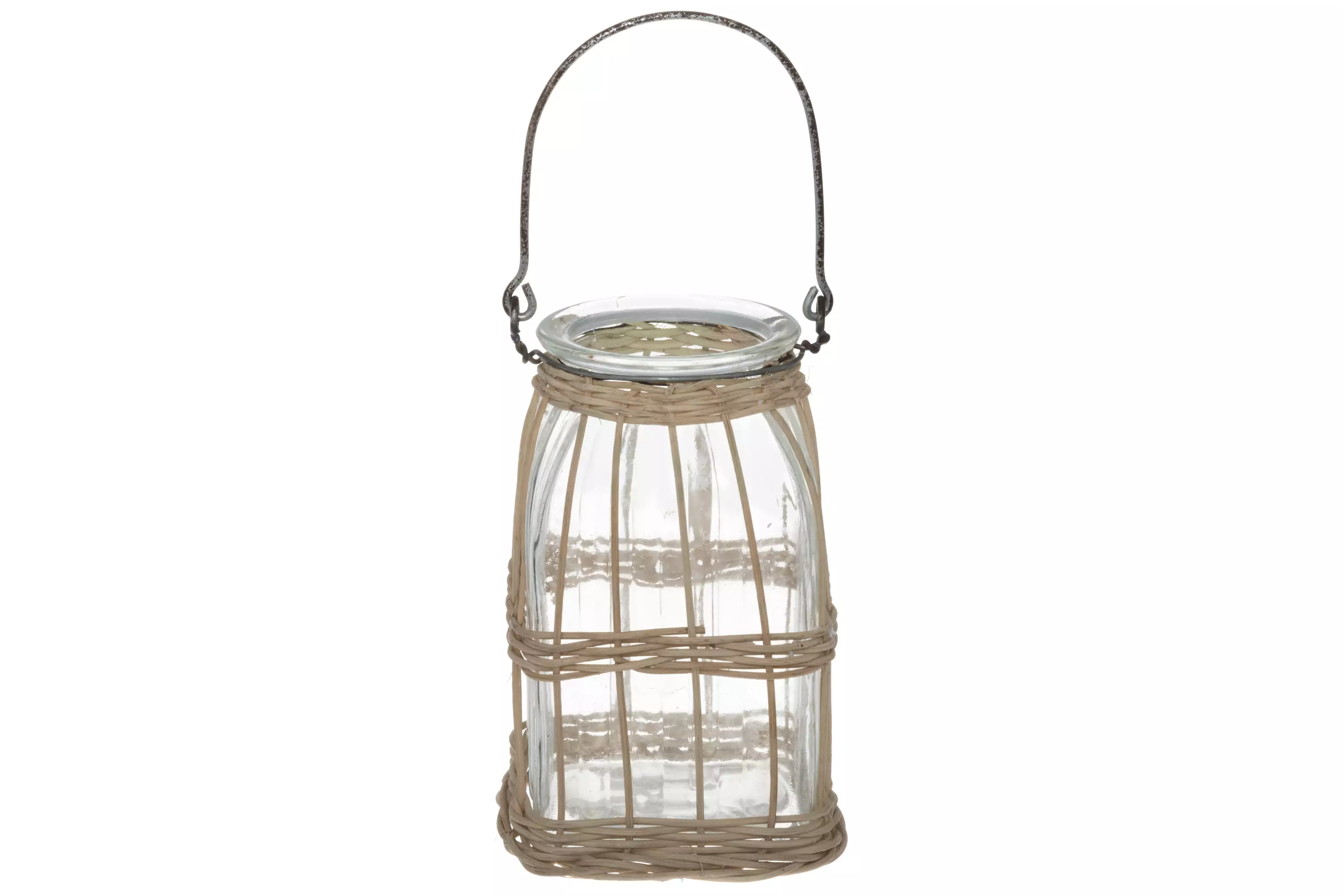Kaunis rottinkipunoksella koristettu kynttilälyhty.