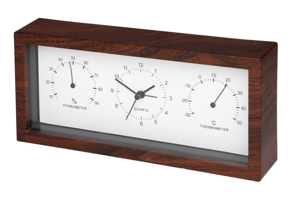 Tyylikkäässä Arno pöytäkellossa on kellon lisäksi kosteusmittari ja lämpömittari. Kellossa on myös herätystoiminto. Hiljainen koneisto.