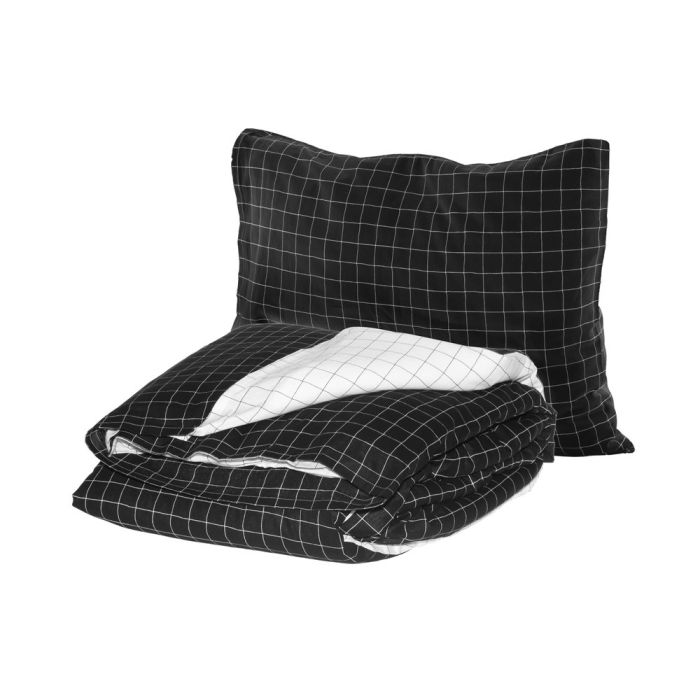 Ruutukuvioinen pussilakanasetti, sis. pussilakanan 150 x 210 cm ja tyynyliinan 50 x 60 cm. Toinen puoli musta, toinen puoli valkoinen. Materiaali 100% puuvilla. Ökotex.