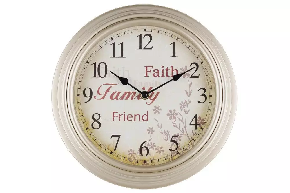 Lämminhenkinen seinäkello. Beige tausta mustilla numeroilla. Hiljainen koneisto. Paristo 1 x AA 1,5V (ei sisälly).