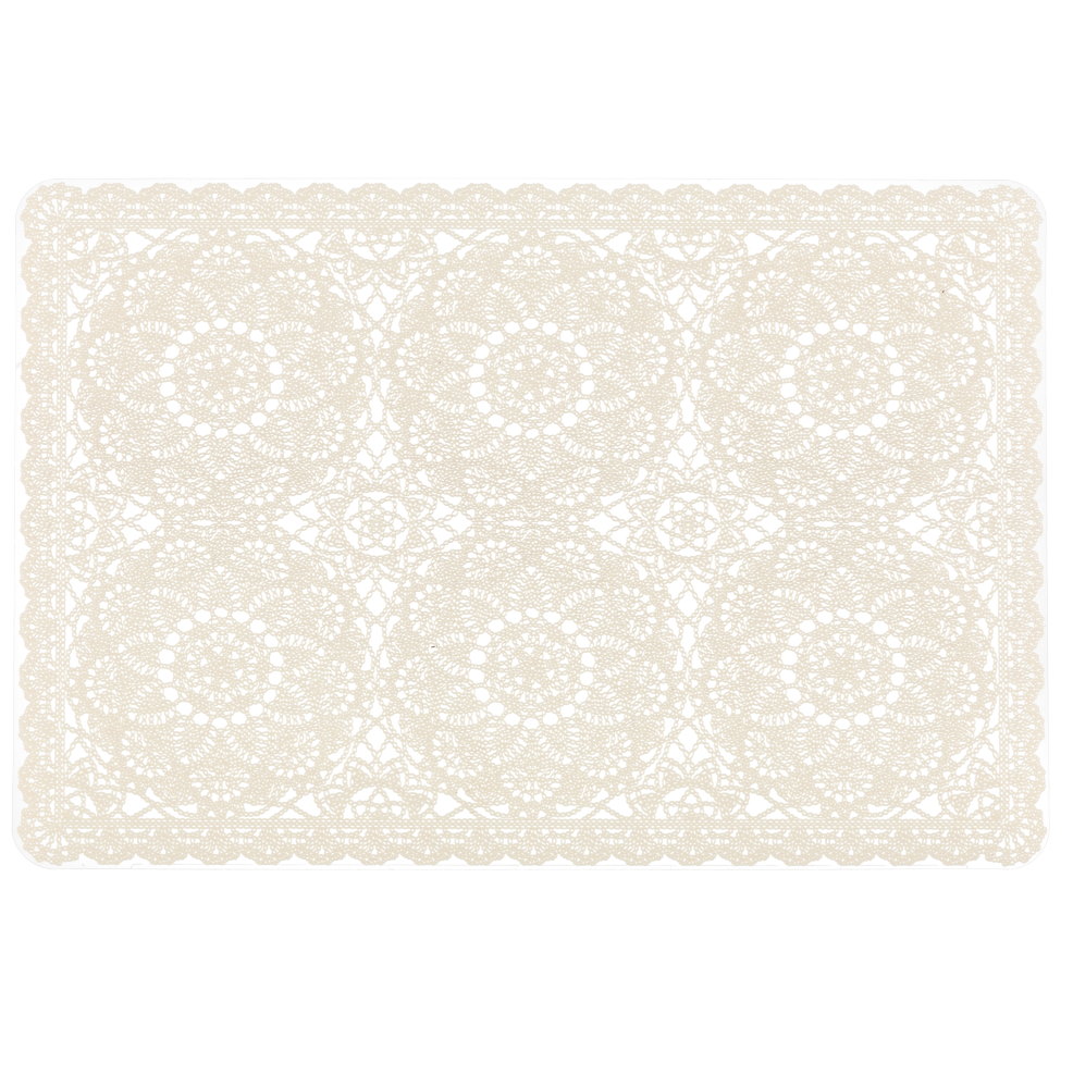 Suorakaiteen muotoinen tabletti pitsikuviolla. Valmistettu helposti puhtaana pidettävästä PVC-materiaalista. Pöytätableteilla saat kotiin uuden ilmeen nopeasti ja luot helposti vaihtelua kattaukseen. Pöytätabletit myös suojaavat pöydän pintaa roiskeilta ja naarmuilta. Koko 30 x 45 cm. Materiaali PVC. Tahrojen puhdistaminen kostealla liinalla.