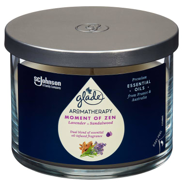 Eteerisiä öjyjä sisältävä Glade Aromatherapy tuoksukynttilä. Vastuullisesti tuotetut tuoksut. Kynttilävaha sisältää 30% RSPO-sertifioitua palmuvahaa. Ei sisällä parabeeneja, ftalaatteja, nitromyskiä, keinotekoisia värejä. Rentouttava Moment of Zen -tuoksu koostuu laventelin ja santelipuun eteerisistä öljyistä.
