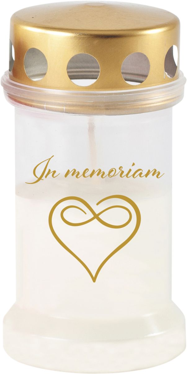 Kaunis valkoinen hautakynttilä sydänkuviolla. Kannen ansiosta palaa myös tuulisella ilmalla. Pitkä 55 tunnin paloaika.