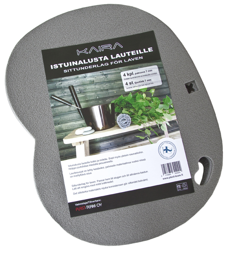 Kulutusta kestävät paksummat istuinalustat lauteille. Soveltuvat kotikäytön lisäksi myös yleisiin saunatiloihin. Pehmeän koostumuksensa ansiosta alustoilla on miellyttävä istua. Eristää lauteen kuumuuden paljaasta ihosta. Säännöllisesti käytettynä alustat vähentävät lauteiden puhdistustarvetta. Yksivärisiä, pakkauksessa neljä samaa tyylikästä väriä. Helppo puhdistaa vedellä ja miedolla pesuaineella.