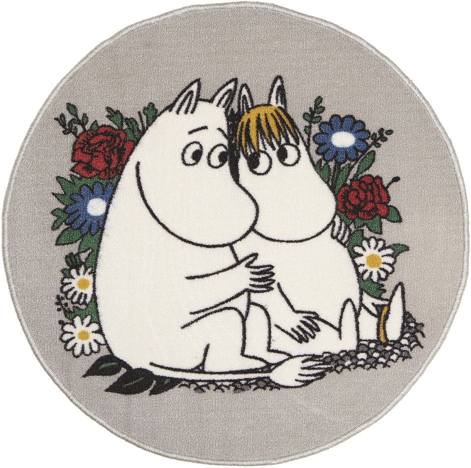 Harmaa, pyöreä Muumi Niiskuneiti & Muumipeikko -matto koossa 80 cm. Helppohoitoiset Muumi-matot sopivat moneen kodin tilaan ja pysyvät hyvin paikallaan liukuestepohjauksen ansiosta. Maton nukka on polyamidia, ja matolle suositellaan tasovesipesua 30 asteessa.