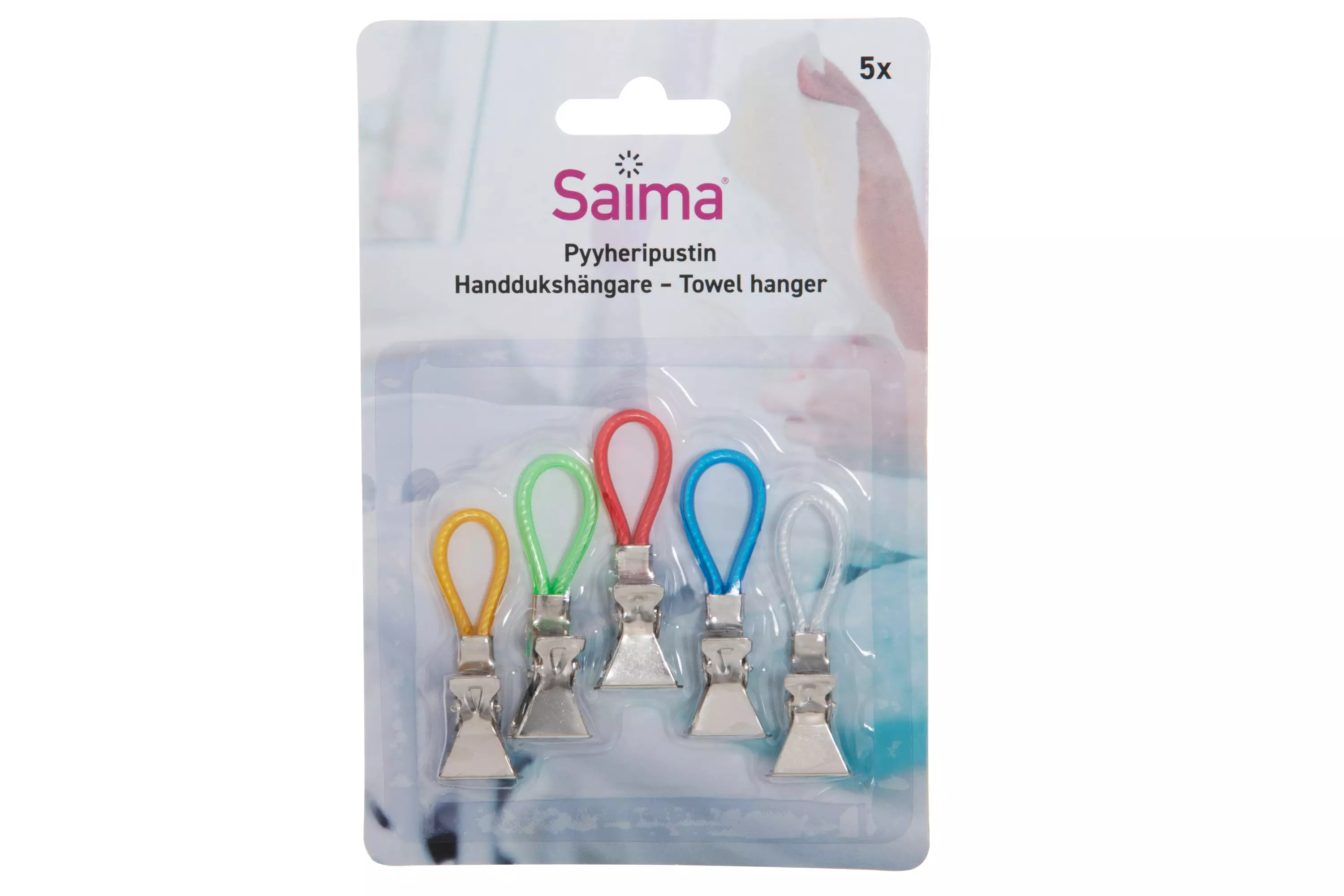 Monikäyttöiset pyyheripustimet helpottavat arkea keittiössä, kylpyhuoneessa ja matkoilla. Pakkaus sisältää 5 eriväristä pyyheripustinta.