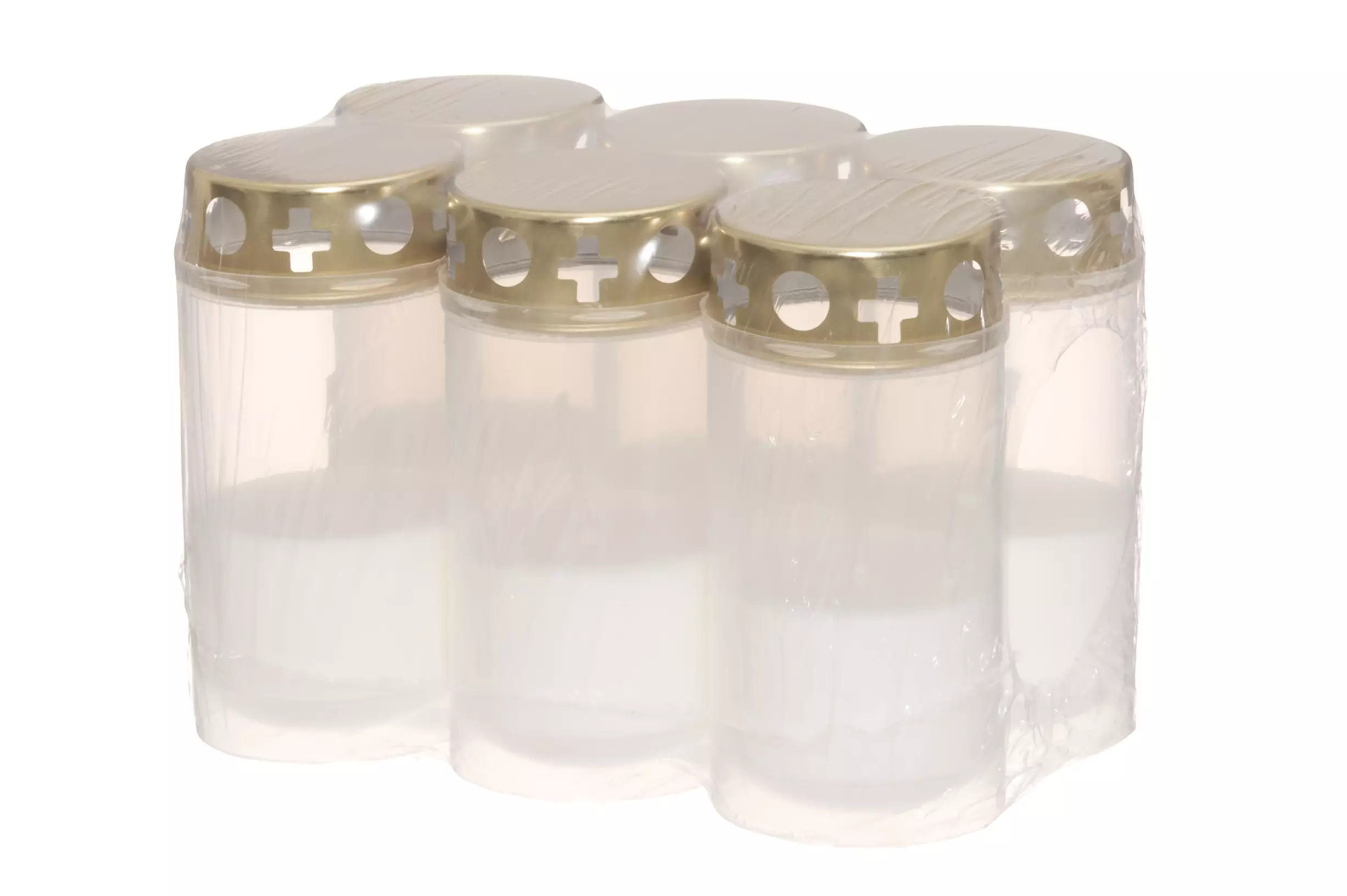 Hautakynttilä kullanvärisellä tuulisuojalla. Pohjan muotoilun ansiosta kynttilä polttaa kynttilämassan tasaisesti. Paloaika noin 25 tuntia.