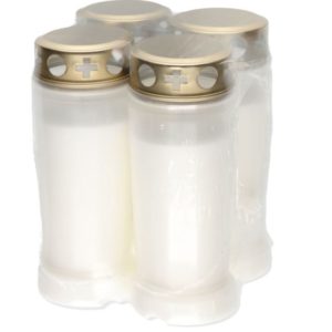 Hautakynttilä metallisella tuulisuojalla. 4 kpl/pakkaus. Paloaika noin 90 tuntia.