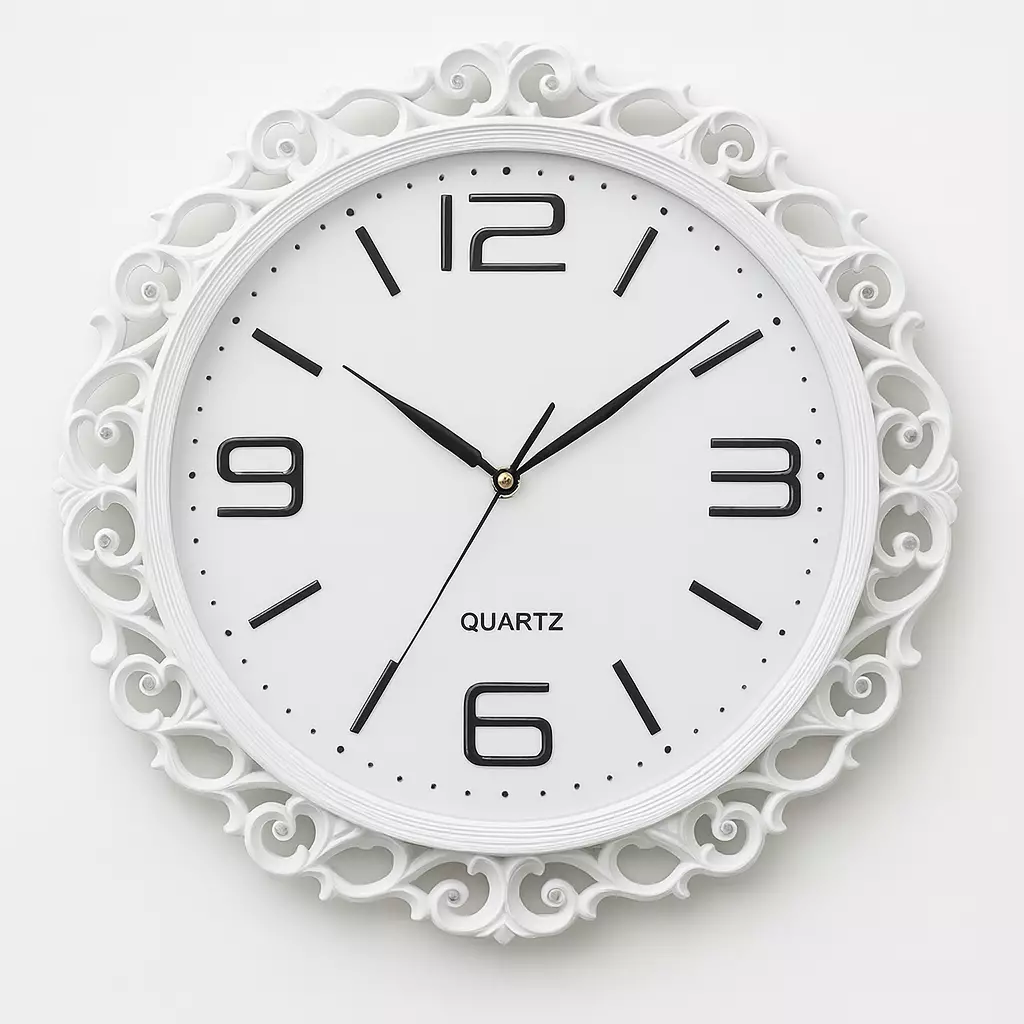 Tyylikäs Seinäkello 47 cm valkoinen yhdistää klassisen muotoilun ja modernin selkeyden. Kellon koristeellinen kehys luo näyttävän ja elegantin ilmeen, joka sopii monenlaiseen sisustukseen – niin kotiin kuin toimistoonkin. Valkoinen väri ja selkeät numerot tekevät kellosta helppolukuisen ja raikkaan lisän sisustukseen.