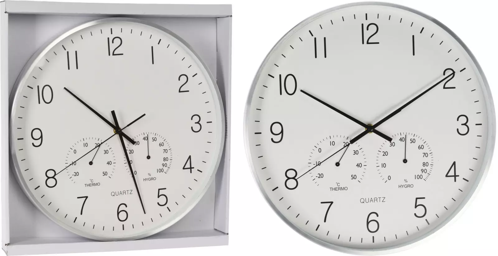 Seinäkello alumiinia 38 cm – lämpö- ja kosteustiedolla