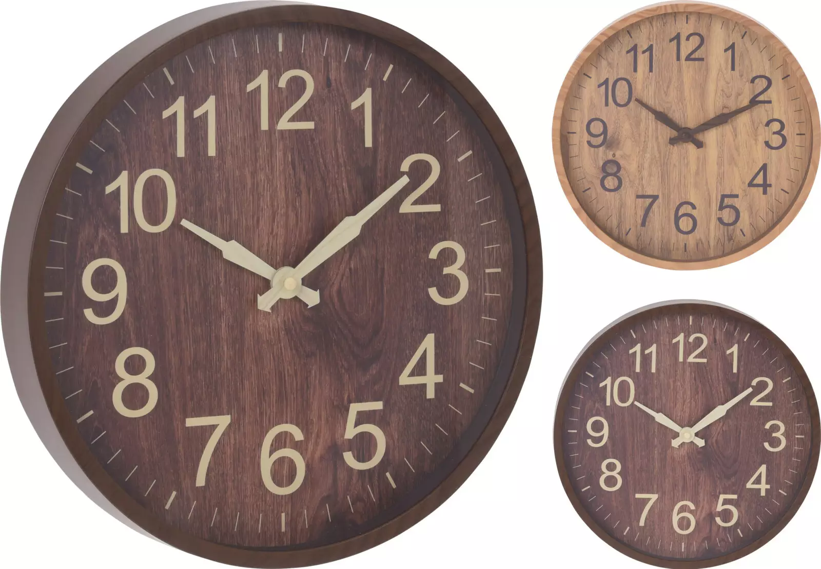 Seinäkello Puu 30 cm Tyylikäs seinäkello puujäljitelmällä tuo luonnollista ilmettä kotiin tai toimistoon. Kellon halkaisija on 30,5 cm ja syvyys 4 cm. Valmistettu kevyestä ja kestävästä PP-muovista, jossa kaunis puun näköinen pinta. Saatavilla kahdessa eri värissä. Hiljainen koneisto ja selkeä kellotaulu tekevät tästä sekä käytännöllisen että sisustuksellisen valinnan. Toimii yhdellä AA-paristolla (ei sisälly pakkaukseen).