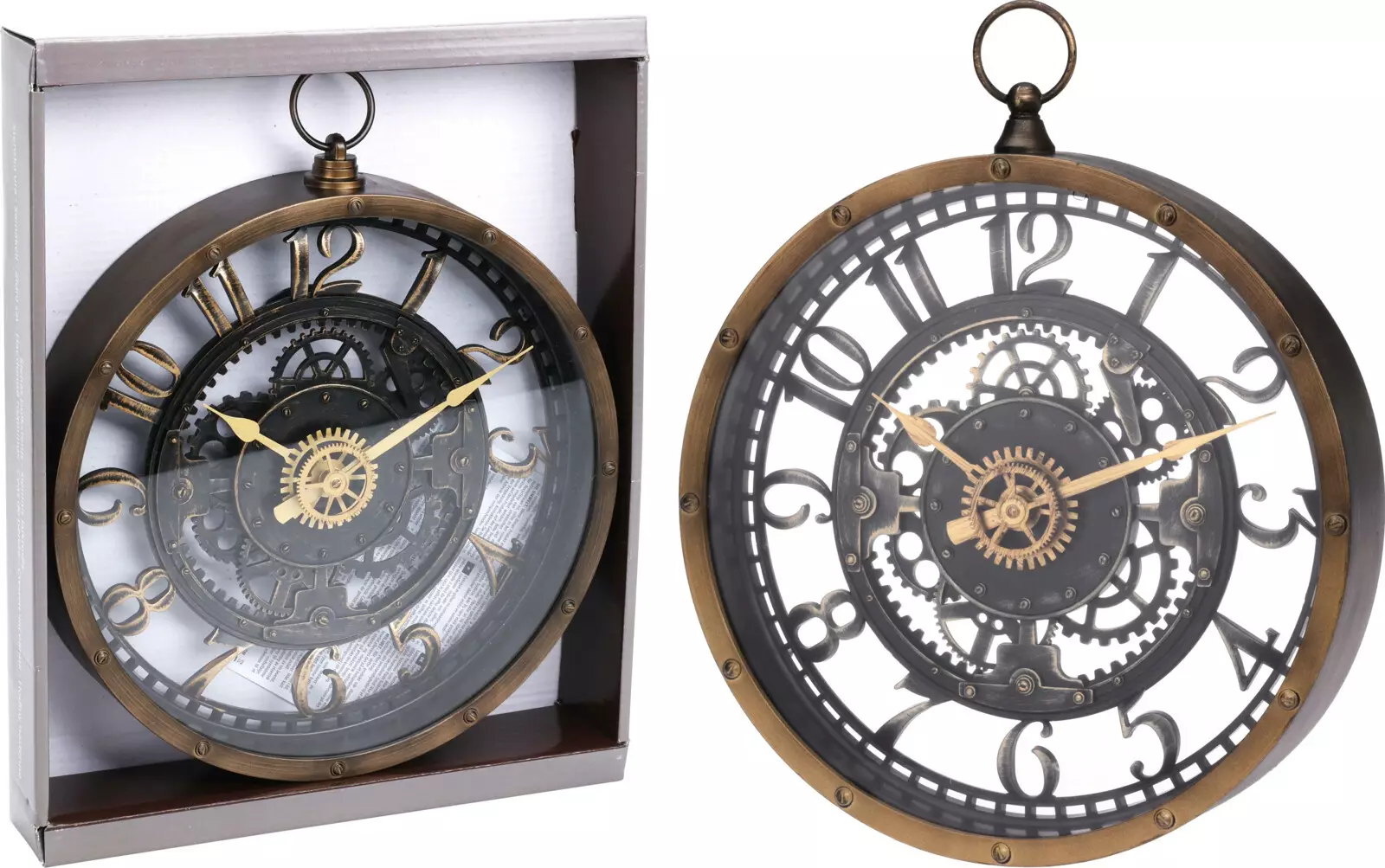 Seinäkello Ratas 267 x 50 mm Tyylikäs antiikkiviimeistelty seinäkello avoimella ratasmallilla tuo näyttävyyttä sisustukseen. Kellossa on 26,7 cm halkaisija ja 5 cm syvyys. Rengasmuotoilu ja avoin rakenne paljastavat kellon sisäiset yksityiskohdat, mikä luo teollishenkisen ilmeen. Valmistettu kestävästä PP-muovista ja lasista. Toimii yhdellä AA-paristolla (ei sisälly). Täydellinen valinta moderniin tai rustiikkiseen sisustukseen.