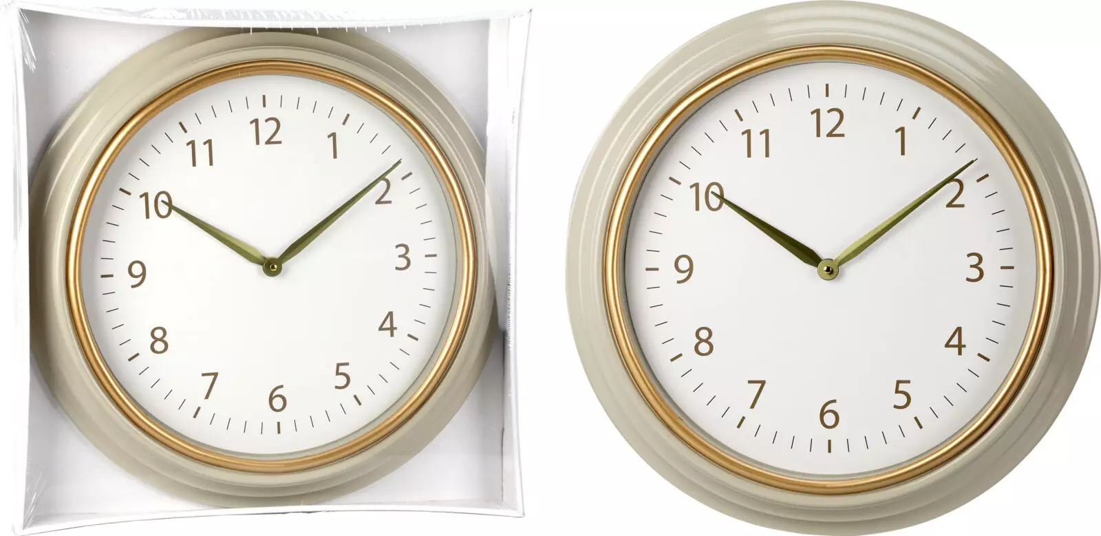 Kellon kellotaulussa on selkeät arabialaiset numerot kullanvärisinä, ja tummat viisarit erottuvat kauniisti vaaleaa taustaa vasten. Vaalea muovikehys kullanvärisillä yksityiskohdilla viimeistelee retrotyylin. Seinäkello toimii yhdellä AA-paristolla (ei sisälly pakkaukseen).