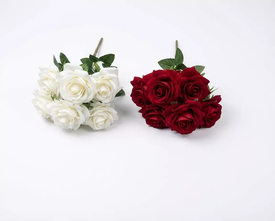 Ruusut ovat muotoiltu luonnollisen näköisiksi, ja vihreät lehdet viimeistelevät kokonaisuuden. Tekokimppu säilyttää kauniin ulkonäkönsä vuodesta toiseen ilman kastelua tai lakastumista.