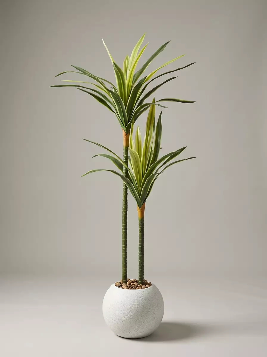 Ryhdikkäät, pitkät lehdet ja luonnollisen näköinen runko tekevät kasvista realistisen ja tyylikkään. Pyöreä muoviruukku (halkaisija noin 20 cm) antaa kasville tukevan pohjan ja viimeistellyn ilmeen.