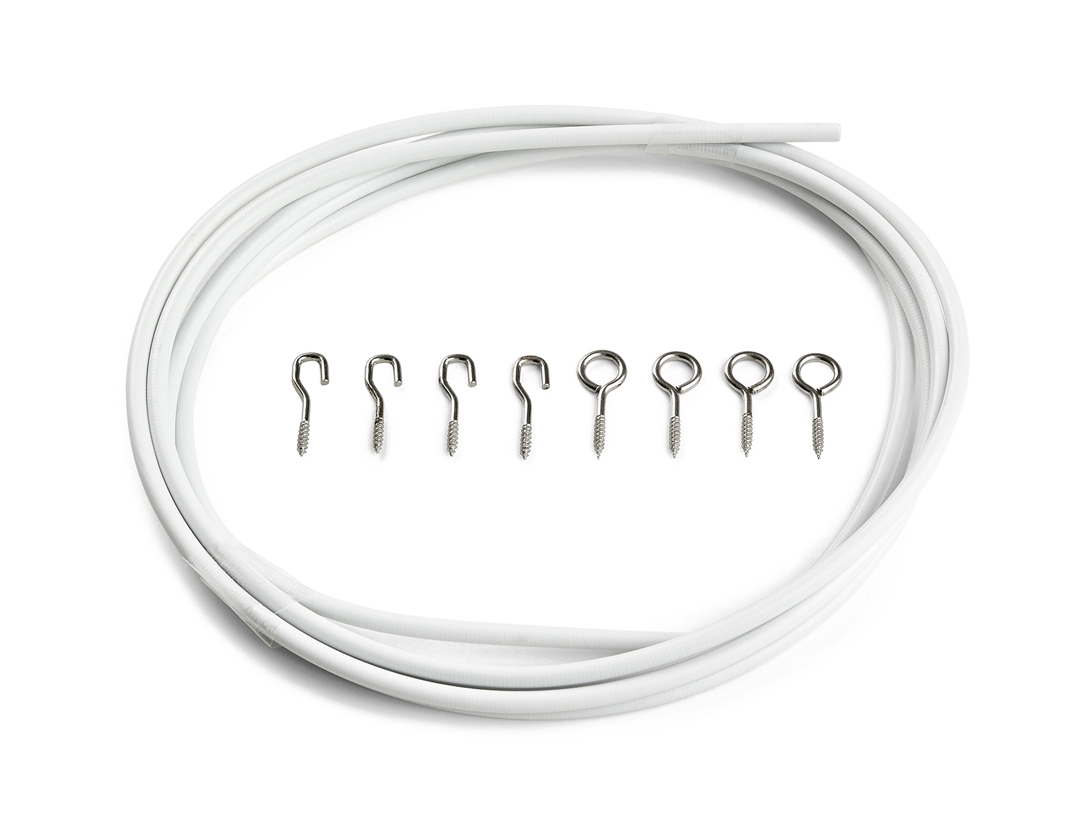 Valkoinen verhovaijeri 5 m teräksestä, muovipinnoite, neljä silmukkaa ja koukkua