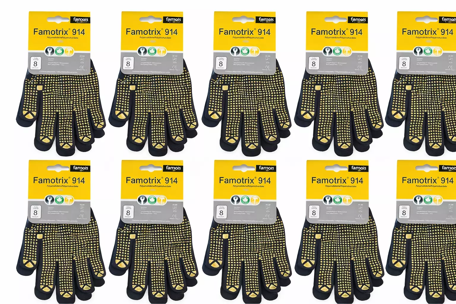 Famotrix 914 polyamidikäsineet 10 kappaleen nipussa tarjoavat luotettavan pidon ja miellyttävän istuvuuden monipuolisiin työtehtäviin. Neulottu rakenne mukautuu käteen hyvin, ja kämmenen vinyylinystyrät lisäävät pitävyyttä sekä turvallisuutta työskentelyn aikana.