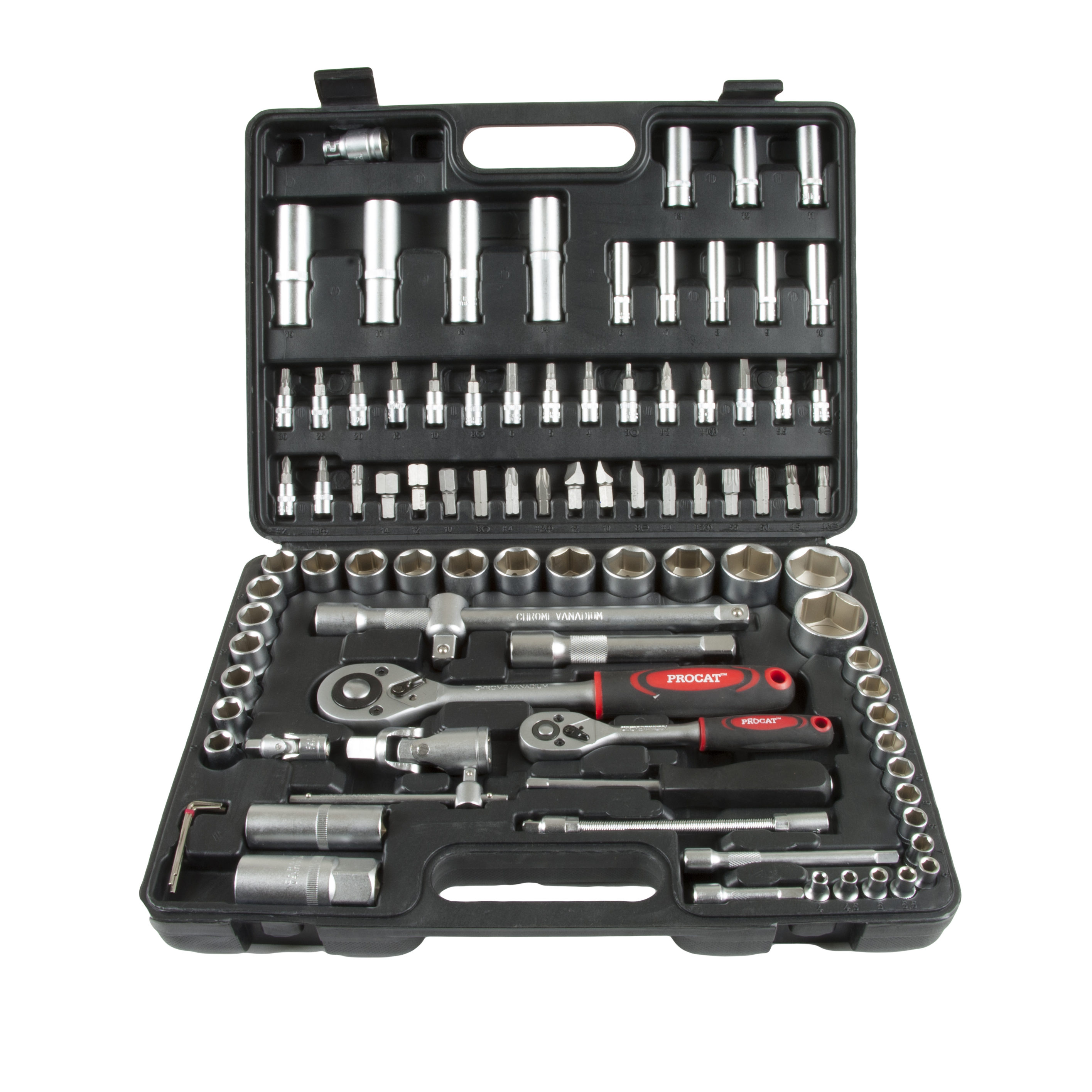 Kattava 94 osainen hylsysarja muovisessa säilytys- ja kantolaatikossa. CrV terästä.